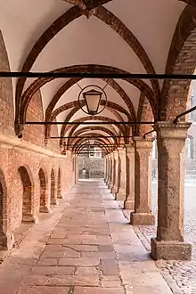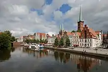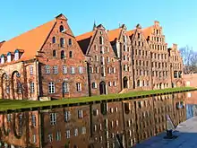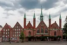 Lübeck is perhaps Germany's finest example of "brick Gothic" architecture, which uses the locally available brick (as opposed to "proper" stone, which was not available to medieval builders in northern Germany) to produce quite stunning buildings. The most notable being the seven spires that form Lübeck's medieval "skyline" but also a range of more or less secular buildings, including the Heilig Geist Hospital (despite being built as a hospital, it cites the Holy Spirit in the name, so whether it is a secular building is debatable) and the medieval town hall.