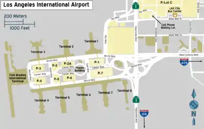 - π Aviation/LAX Station (nearest Metro Rail station) further south at Aviation Blvd and Century Freeway (I-105):