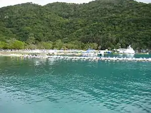Labadee is a port in Northern Haiti. It is a private resort leased by Royal Caribbean International (RCI) for use by its Royal Caribbean Cruise Line and Celebrity Cruise line cruise ships. Royal Caribbean International has contributed the largest proportion of tourist revenue to Haiti since 1986. The resort is completely tourist-oriented and safe as there is a personal security force. A controlled group of Haitian merchants are given sole rights to sell their merchandise and establish their businesses in the resort. The site is fenced off from the surrounding area. The cruise ships anchor either at the pier or offshore and passengers walk from the pier to dry land or are ferried to the resort when ships have to anchor offshore.