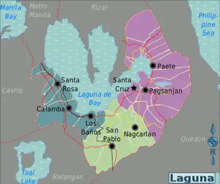 | Northwest Laguna (Bay, Biñan, Cabuyao, Calamba, Los Baños San Pedro) Urban sprawl with a mix of modern communities and crowded communities; major draws are the hot springs and the Rizal mansion, Enchanted Kingdom in Santa Rosa, and lovely downtowns with Spanish-era churches. |