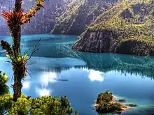 Lagunas de Montebello National Park is in Chiapas in the southern part of Mexico, near the border with Guatemala. It is famous for its many colorful lakes (CONANP says more than 60, some other sources say 59). The lakes are remarkable for the wide range of natural water colors they exhibit; colors that range from light aquamarine to a brilliant deep purple. Some lakes are green, others blue, a few red. The park is a designated UNESCO Biosphere Reserve.
