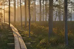 One of the most widely recommended places to go there is Viru raba, which has a 5-km foot roundtrack and observation tower. The following two trails cover this sight. The third one is longer, more diverse and includes a larger swamp than Viru raba, south of the highway. The projected walking times depend on whether you are just there for the hike, or also want to take your time for bird watching, longer breaks and such. All three allow for day tours from Tallinn, depending on your level of fitness. The tours partly correspond to sections of the "official" RMK matkatee (hiking path by the forest authority).