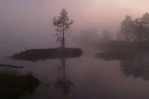 The "speciality" of the Lahemaa National Park are the huge water reservoirs called bogs. They get their water supply from the rain. Their surface is often covered with a thick and soft Sphagnum moss, which absorbs water into its empty cells. The lack of oxygen and acidity in a bog is the reason why dead plants deposit as partially decayed vegetation matter, the peat. A water drainage through the peat works very slowly. During the process of growth of a bog, wet hollows are enriched with oxygen, decomposition is accelerating and bodies of water, called bog pools, form. The process takes several thousand years. The depth of bog pools is generally less than 2 m, but can reach a maximum depth of 3–4 m in Viru raba. The humin acids found in the peat give the brownish hue and acidity to the bog water. Due to its acidity, this environment is unfavourable for the growth of many organisms.