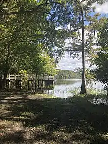 The boardwalk at Lake Ashby crosses a portion of Lake Ashby in Volusia County, Florida, before entering the rainforest.