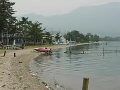 A bicycle rental for ¥500 per day for a "mama-chari" type bicycle (a single speed 26 inch bike with a highly adjustable and comfortable seat and a basket in front) from right next to the train station from Osaka. Bicycling around the Lake Biwa area is great fun, with wide paved paths in many places, and approximately a 220km bike ride to go around the lake. Bicycle friendliness is evident everywhere and you should be able to find places to stay at various points around the lake if you bike tour. Witness four man or woman rowing teams in action on the Satagawa River during your tour. Ride a functioning sternwheeler, the "Michigan". Many parks, public restrooms and places to get water or drinks are near the southwestern part of the bike path. A volleyball court is on the beach northwest of the southernmost bridge and many joggers also share the bike paths. Fishing from a boat or the shore, kayaking and sailing are popular here. A successful cicada hunt by a young boy with a butterfly net was witnessed, but giving off a loud buzzing sound, the cicada got away when the boy lifted his net. Kite flying during windy conditions could also be fun here, with no nearby wires to foul the kite line.