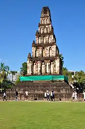 🌍 Wat Kukut (Wat Chamthewi), Chamadevi Rd (About 1.5 km northwest of city center). Commonly referred to a Ku Kut (กู่กุด), built in the Lawo (Lopburi) style. One of the outstanding stupa (or chedi) in Dvaravati style (from the 6th to the 13th centuries). It has a square base and five terraces modeled on Gupta style of architecture. The lowest being the biggest and the smallest terrace at the top. As Hindu gopurams in South India, each terrace has niches, housing standing Buddha Images. The "chedi" houses the ashes of the queen Cham Thewi of Haripunchai kingdom. The adjacent temple was built in the 13th century CE. The chedi is a square structure similar to Buddhagaya in India.