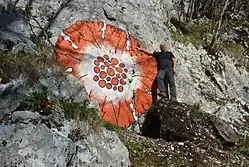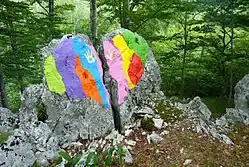 Land art is today a very diverse art form. The works are created in the very nature using natural materials found in situ (stone, gravel, soil, tree trunks, branches, leaves, snow, water...). Sometimes artificial materials are introduced. Painting the rocks with eco-friendly paints, as is the case in some of the works on this trail, is called the rock art. The land art works are situated in the open air, located far from civilization, left to change and disintegrate under the influence of natural forces.