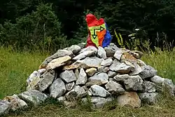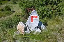 Hemispherical stone mound (∅ = 160 cm) with painted capstone and two branches directs hikers on the right path.