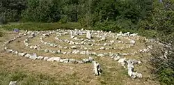 Labyrinths are complex forms of path leading to the center and back, and mazes are wide networks that require resourcefulness and orientation to find out the exit. The famous ancient labyrinths like Minoan on Crete, Roman mazes, labyrinths in medieval Christian cathedrals, and even todays labyrinths in certain circles, are given spiritual significance – circling the winding paths of the labyrinth to its center represents the quest for answers and the journey to the center of the soul, coming into the center of labyrinth symbolizes contact with the divine and the acquisition of knowledge or insight, and then follows the return and realization of acquired insights. Labyrinth can be shown on a drawing or picture, but if it is made in the form of geoglyph (petroform) falls under land art.
