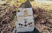 As this is not an ordinary hiking trail but art walk, signposts on the trail are also designed in art manner. Handprint with the labyrinth is the logo of Land art trail and is located at the entrance signposts, but also on those that show the branches of trail that lead to some indented land art points. The palms with the labyrinth mark each land art point on the trail map too.