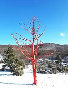 The message of this land art is the negative impact of humans on nature. The gas pipeline, powerline, transmitters, radar, road, the Učka tunnel – all of these are artificial structures which unnaturally stick out amidst the mountain beauty. And so this red tree 5.5 m high, located on high ground in the middle of Sapaćica pasture, between the route of the gas pipeline and power line, unnaturally dominates the landscape, transmitting a message about our destruction of nature.