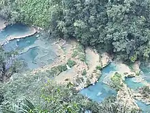 - Semuc Champey - Located about 7km outside of Lanquin, along rough road is a series of tiered limestone pools of varying shades of turquoise. A wild river runs underneath the pools here. Hike up to the mirador for a view pools. Swim in the pools and jump off of the rocks. (Feb 2023) Q25 for a pickup ride from Lanquín to Semuc Champey. The road is under construction to be replaced with a paved road, therefore, expect extra time to get there.