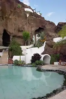 - 🌍 Jameos del Agua (in the Malpais de La Corona, north of the island.). Daily 10:00-18:30, and Tu F Sa 19:00-02:00. Restaurant Tu F Sa 19:30-23:30. Neat dress (no shorts or t-shirts) and no flash or lit photography after 19:00. A jameo is a volcanic formation formed when the ceiling of an underground lava tunnel collapses, exposing a section of the tunnel to the sky. A bar, restaurant, swimming pool, and concert hall were all built within one such formation, near the coast, under the guidance of César Manrique, and opened to the public in 1966. €11.