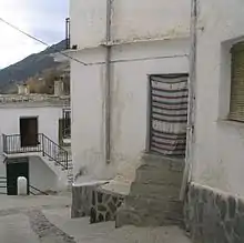 A street corner in Trevélez showing traditional architecture and door curtain