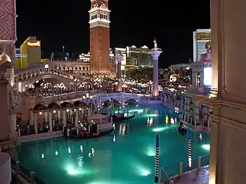 - π The Venetian, 3355 S Las Vegas Blvd, β +1 702 414-4100. A high-end hotel located near the center of the Strip and offering everything from the Grand Canal shops to shows and connected to the Palazzo complex. Rooms are spacious with quality furnishings although no coffee/tea making facilities and it can be a long walk from your room to facilities. Plumbing occasionally questionable (noise and temperature).