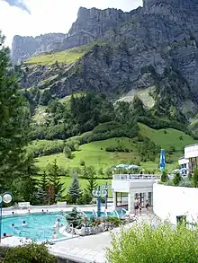 Leukerbad (elevation 1411 m) is a mountain spa and ski resort in the canton of Valais in Switzerland. It is best known for its thermal springs (up to 51° C) and unique mountains scenery.