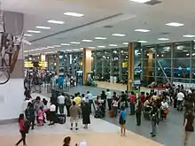 The area immediately outside of customs is typically crowded, full of people waiting for arriving passengers. It's not uncommon for entire families to show up to greet a returning family member and the crowd is further swelled by pre-booked car and taxi service drivers holding up signs with passengers' names; a large area where passengers can stand freely and scan the crowd to look for people and not be accosted has been cordoned off in front of the customs exit.