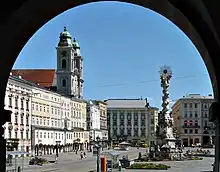 - 🌍 Trinity Column (Dreifaltigkeitssäule/Pestsäule), Hauptplatz (in the centre of the square). One of Austria's most attractive closed squares, there stands the 20-m-high Baroque Trinity Column (completed in 1723). Carved in white marble by Sebastian Stumpfegger according to a model from Antono Beduzzi, the column bears three inscriptions. These announce the dedication of the column to the Holy Trinity by the guilds, the Emperor and the people of Linz in gratitude for deliverance from the dangers of war (1704), fire (1712) and plague (1713). The column is flanked by the patron saints Sebastian, Florian and Carlo Borromeo.