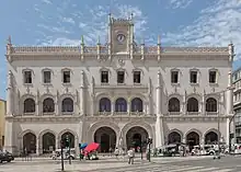 Restauradores - Glória 51E ). Ths major square lies at the southeast end of Avenida da Liberdade. The Monument to the Restorers, a 30 m (98 ft) obelisk commemorating the 1640 restoration of Portugal as a kingdom separate from Spain, sits in the middle of the square. - 🌍 Rossio Station (Metro station Restauradores Azul or Rossio Verde ). Built in 1890 as the Estação Central (Central Station), it was the main railway hub until 1957. It provides a direct connection to Sintra in about 40 min. The trains access the station through a 2.6-km long tunnel. The main facade is an example of the Neo-Manueline style, a revival of Gothic style in Portugal during the mid-19th century.