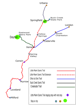 The bike trail was built atop of an abandoned railroad and connects Milford with Xenia, a distance of 50 miles, with several branch trails further connecting the main trail with other cities.