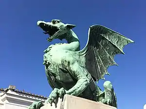 - 🌍 Dragon Bridge (Zmajski Most). Completed in 1901, designed by Croatian Jurij Zainovich. It is guarded by four detailed dragon statues from the city's coat-of-arms. Look out for the dragon motif throughout the city. Be careful around the Dragon Bridge area, as it is on a major busy road just outside the pedestrian zone and near misses (and worse) between inattentive tourists and traffic are common. The dragon bridge is located at the end of the Ljubljana Open Market, just a block or two down the river (north-east direction) from the Triple bridge.