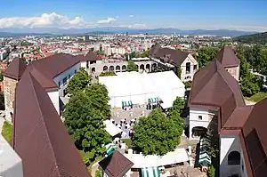 - 🌍 Ljubljanski Dvor, Dvorni trg 1, ☏ +386 1 251 6555. M-Sa 10:00-00:00, Su 12:00-23:00. Pizzeria with nice patio overlooking the river, the quality of food is uneven.