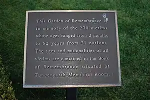 - 🌍 Dryfesdale Cemetery, Dumfries Rd, Lockerbie DG11 1HZ. Visitor centre Mar-Oct daily 10:00-15:00. This contains the town's main memorial to the Flight 103 disaster, with a Garden of Remembrance, a memorial monument, and stones for the individual victims. The cemetery is always accessible. Dryfesdale Lodge is the visitor centre.