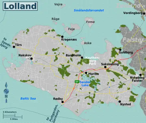 Lolland is an island in southern Denmark. The island sits at the busy traffic connection between Copenhagen and Germany, thus many people come to the island, but only few of them stop there. The ferry between Rødby and Puttgarden is one of the busiest crossings in the world, and the boats carry anything from goods and people to cars across the narrow straight. Construction of a fixed link began in January 2021.