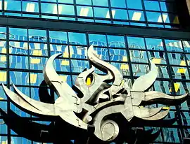 The Metcalfe Federal Building's lobby on the left at the intersection of Jackson and Clark contains another larger than life statue. Frank Stella has created a whole series of Moby Dick related abstract sculptures; this one is named after a specific chapter, The Town-Ho's Story. It's a terrific mess of 13,000 lbs. of steel and aluminum. The link to Melville's novel is not very clear, but the sculpture is impressive and purposefully abrasive.