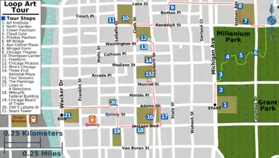 You won't need to bring much else besides this article. If you are planning on doing the full itinerary, be sure to wear comfortable shoes. In total, it's a 2.7 mile-walk (4.3 km), and that doesn't include time spent indoors. Inclement weather will make the walk less enjoyable, but only a real storm or the most frigid weather would really stop you from making the journey. Check the weather before you head out and bring rain/snow gear as appropriate. Don't forget your camera and consider bringing along the Wikivoyage map of the Loop, in case you want to stop in a cafe or finish with a beer.