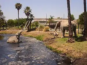 - π Page Museum at the La Brea Tar Pits, 5801 Wilshire Blvd, β +1-323-934-7243. Daily 9:30AM-5PM. An excellent museum that displays fossils of animals β including saber-toothed cats, dire wolves and mammoths β that got stuck in tar pits during the Ice Age 10,000 to 40,000 years ago. Visitors can watch fossils being prepared and learn about the natural and human history of the tar pits. However, the real highlight is just outside the museum in Hancock Park, where you'll find a Pleistocene Garden and the tar pits themselves, with life-size replicas of extinct mammals and where you can witness the ongoing excavation of the pits. Adults $12, youth (13-17)/seniors (62+)/college students (w/ ID) $9, children (3-12) $5, children under 3 free. Free general admission for everyone 1st Tu of the month, except July and August.