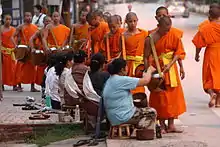 - 🌍 Alms ceremony (Sai Bat), Sisavangvong Rd. Daily 5-6 AM. Monks at dawn collect alms of rice from kneeling villagers (and early-rising tourists). Ask your guesthouse host to assist you the day before in preparing if you'd like to get up and give alms in the morning. The alms giving ceremony is one which, while picturesque, is not without its detractors. Unscrupulous local merchants have used the eagerness of tourists to participate in this tradition as a means of making easy money. They sometimes sell unsuitable, stale and even unsafe food, resulting in monks falling ill after having consumed the offerings, Hence the growing resistance to continuing the tradition. The government, however, has made it clear that the monks must continue the custom or be replaced by lay persons clothed in saffron robes in order to keep up appearances, thereby maintaining tourist revenue. If you wish to participate in this ceremony, prepare the food or fruit yourself. Avoid giving food of dodgy quality. Another problem is the rampant photography: while a photo might look nice in your collection, think about how it must feel for the monks to have hundreds of tourists photographing them every day. Some lowlifes even stand next to the monks, blinding them with flashbulbs. Consider watching this old tradition from a distance instead of degrading it.
