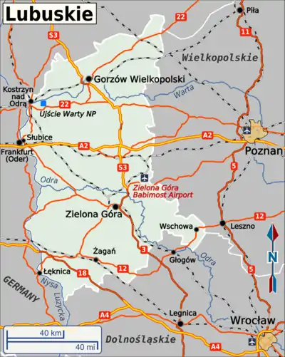 There is no international airport in the Lubusz Voivodeship. The nearest international airports are Poznań's Poznań-Ławica Airport (POZ IATA), Wrocław's Copernicus Airport (WRO IATA) and Szczecin's Szczecin-Goleniów Airport (SZZ IATA). Berlin Brandenburg Airport (BER IATA) in Germany might also be a good choice for western Poland, as many international connections are available from there.