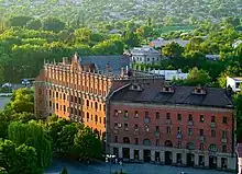 The central, Leninskyi district, together with parts of KamyanoBridskyi district contains most of the main places of interest. Close to the railway on both sides are several buildings and streets which survived the destruction of World War II or were reconstructed, and now form a compact so called "old center," along streets of Dahl, Lenina, Karl Marx and Karl Libknecht. The new center was completely rebuilt or built anew on a rather high hill in the center between Luhan' and Olhivka rivers and Ivanischev yar. Owing to the number of communist oligarchs that lived there and number of not drive-through yards it was dubbed "Dvoryanske hnizdo" (a nest of nobles). South of Leninskyi district is a remote district of Hostra Mohyla, containing a memorial to heroes of wars of 20th century, several medical facilities and institute and an air navigators academy.