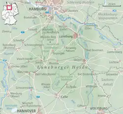 The Lüneburg Heath (Lüneburger Heide) is an extensive region of heath and farmland in the state of Lower Saxony (Niedersachsen) which has become a popular holiday and excursion destination. It lies roughly between the cities of Hanover, Hamburg and Wolfsburg. Historically it was where General Montgomery received the German surrender at the end of the Second World War.