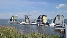 Several of the lakes are linked to each other via canals and some are open to motorized shipping whereas all are open to unmotorized watercraft. There are two passenger boats, both run by Reederei M. Löwa one is called "M.S. Santa Barbara", the other "Aqua Phönix".