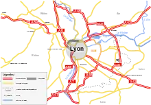 - A42 to the northeast — Bourg-en-Bresse, Geneva (Switzerland), Germany.