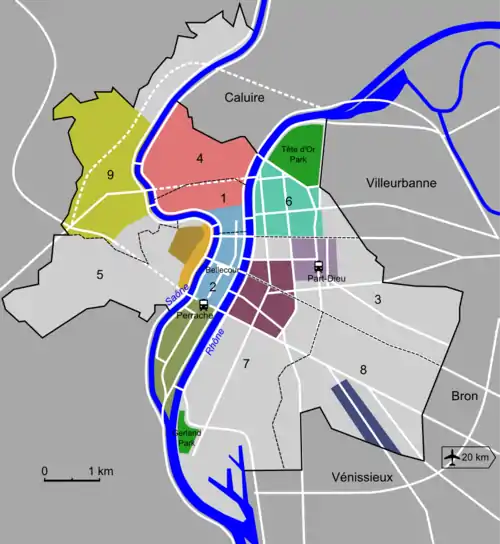 Lyon has nine administrative subdivisions called arrondissements, which are designated by numbers. They correspond approximately to the following neighbourhoods: