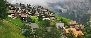 Mürren is a mountain village in the Bernese Oberland of Switzerland, with a resident population of 155 (2015) but hundreds of seasonal workers and 2000 hotel guests. It grew with the tourist industry since the 1890s, when the railway and cable car meant you could ski downhill without first hiking up the mountain. There is no road access, so it's a charming traffic-free village.