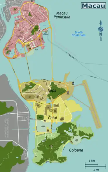 | Taipa (氹仔 Tam Chai) The island south of the peninsula, accessible via three bridges. It is a major residential center and is the location of Macau's International Airport. |