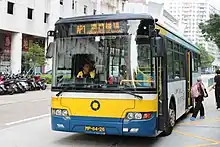 Bus AP1 plies a route between the airport and the Barrier Gate. Its route passes through several points on Taipa Island, and it stops at the ferry terminal on the peninsula on the way. It costs MOP$4.20 per passenger, MOP$3 per bag. It has limited provision for baggage, and can be very crowded (you may not even get the first bus to arrive). Change at the ferry terminal for other destinations, the frequent number 3 bus runs from the ferry terminal and passes the Lisboa, Landmark Hotel, and Holiday Inn, or catch one of the hotel/casino shuttles which go the ferry terminal. The buses do not give change, but there is a currency exchange just inside the terminal that will change foreign currency into low denomination MOP.