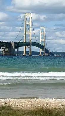 Mackinaw City is a city of 800 people (2018) in the Mackinac Area at the tip of the Lower Peninsula of Michigan. It's the southern terminus of the 5-mile Mackinac Bridge.