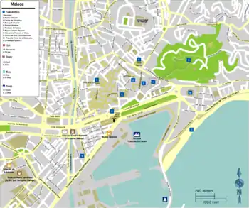 - 🌍 Castillo de Gibralfaro, C/ Gibralfaro 11 (at the top of the hill, you can walk or take bus #35). Tu-Su 9:30-19:00, closed on Mondays. Another Moorish castle and the counterpart to the Alcazaba, the Castillo sits on a larger hill behind the Alcazaba and offers an incredible view of the city and neighboring suburbs from the ramparts that encircle the castillo. Within the fortress is a set of gardens and some displays, including an exhibit on the various military forces to have occupied the fort. Between the Castillo and the Alcazaba, visit the Alcazaba if you only have time for one, as the Castillo requires a hefty hike or a bus ride (bus 35) up the mountain. €2.10, free Sundays after 14:00.