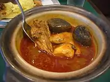 - Bak kut teh (肉骨茶), lit. "pork bone tea", is a simple-sounding soup of pork ribs simmered for hours in broth until they're ready to fall off the bone. It's typically eaten with white rice, mui choy (pickled vegetables) and a pot of strong Chinese tea, hence the name — the broth itself doesn't contain any tea. To impress the locals, order some you tiao fritters from a nearby stall and cut them up into bite-sized chunks to dip into your soup. The port town of Klang is said to be original home of the dish.