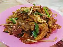 - Char kway teow (炒粿條) is a favourite noodle type in Penang and Singapore. Some flat rice noodle fried with soya source, prawn, cockles, bean sprouts, chives & bak you (lard), though this last ingredient is sometimes absent due to the popularity & demand of this dish from the Malays & Indian Muslims who traditionally shun pork. It is typically salty in Penang, but a little sweet in Singapore due to the addition of sweet soy sauce.