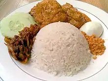 - Nasi lemak (lit. "fatty rice") is the definitive Malay breakfast, consisting at its simplest of rice cooked in light coconut milk or coconut cream, some fried ikan bilis (anchovies), peanuts, slices of cucumber and a dab of chilli on the side, traditionally wrapped in a banana leaf (though paper is becoming more common these days). Originally, the 'ikan bilis' was cooked together with the chilli & spices to make "sambal tumis ikan bilis" but it makes more commercial sense to the business man to have them separated as it is easier to make & the fried anchovies will last longer. A larger deep fried fish (ikan kuning) or chicken wing are common accompaniments. More often than not, it is also combined with a variety of curries and/or sambal (see below).