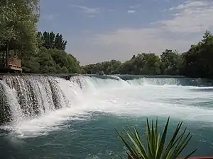 - 🌍 (Manavgat Şelalesi) (6 km north of city centre). Though the fall is only a few metres high, the riverbed is wide and the flow high enough to make the falls thundering and white all over. In the viewing area, it's possible to wet your feet immediately on the edge of the fall safely in a small fenced area. The water is refreshingly cold! This waterfall is the main attraction of the town and there are modern cafes and shops in the adjacent area where you can buy tourist kitsch and overpriced but good meals. It's illuminated so can be conveniently visited also after the night falls. The whole site has been 'upgraded', so that there are smart paved areas, new restaurant and a McDonald's. Car parking is a bit limited. 7 TL.
