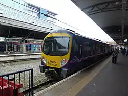 Trains run from the Station to Manchester Piccadilly every 15 min or less between 04:15 and 01:15, taking 15-20 min. Walk-up single fare is £6.20. Trains that are continuing to other northern cities may also stop at Manchester Oxford Road (for south city centre, eg Bridgewater Hall) and Victoria (for north city centre). Between 01:15 and 04:00 take the bus.