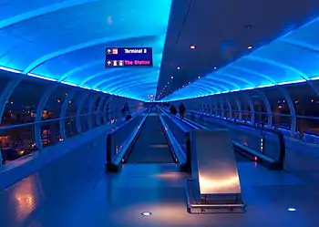 Manchester Airport has three terminals, linked by an overhead covered walkway ("Skyway") to the transport hub of "The Station". T1 and T3 are adjacent 200 yards (5 min) walk south of The Station while T2 is 400 yards (10 min) walk northwest. There are travelators in the Skyway, but they're often out of action.