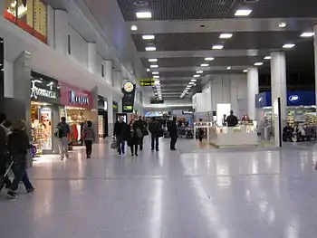 🌍 Terminal 1 has the most flights and the best facilities. Charter, budget and full-service airlines fly across Europe and the rest of the world, including Aegean, Aer Lingus, Air Transat, Aurigny, Austrian, BH Air, Belavia, easyJet, EL AL, Enter Air, Emirates, Etihad, Finnair, Icelandair, Iraqi Airways, Jet2, Lufthansa, Norwegian, Scandinavian, Swiss, TAP Air Portugal, Titan Airways, and Turkish Airlines. There are two check-in halls: the smaller Hall B, by the ground floor entrance, is only for Jet2 and Etihad. All other airlines use Hall A on the 5th floor (with Lufthansa hidden in a back lobby) - take the bank of lifts to your left immediately you enter T1. If you walk past them, you'll stray into the large arrivals area - lots of cafes here, plus arrivals boards to check your turnaround flight. After check-in, there are two security routes, used flexibly. Security A is sometimes congested while Security B is quiet, but staff will direct you to the one with the shorter queue (at quiet times they often reserve A for fast-track). Just after clearing security are cold water faucets/taps, your best chance to refill a bottle as all the other outlets (e.g. in toilets) are scalding to make you buy overpriced bottled water. You now enter a series of 3 retail malls: straight then winding then straight, uncannily like the digestive tract of a monster squeezing every drop of life-blood from its prey. You emerge into a concourse with gates 1-15 to the left, 20-32 to the right, gates 16-19 are usually used by the smaller planes and can be accessed by a corridor also used for lounge access. The two wings towards the gates have complimentary newspaper racks (Times and Sun) and more seating, but no retail/eating except a few vending machines. Gates 20, 24, and 26 are downstairs saloons for a bus transfer to the aircraft: they're often the quietest areas for sitting.